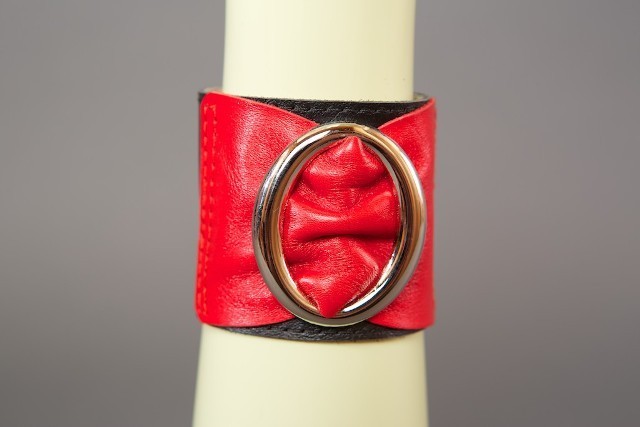 Секс шоп » БДСМ / Фетиш » Наручники / Фиксация » Напульсники, манжеты » Красно-чёрный кожаный браслет с овальной пряжкой